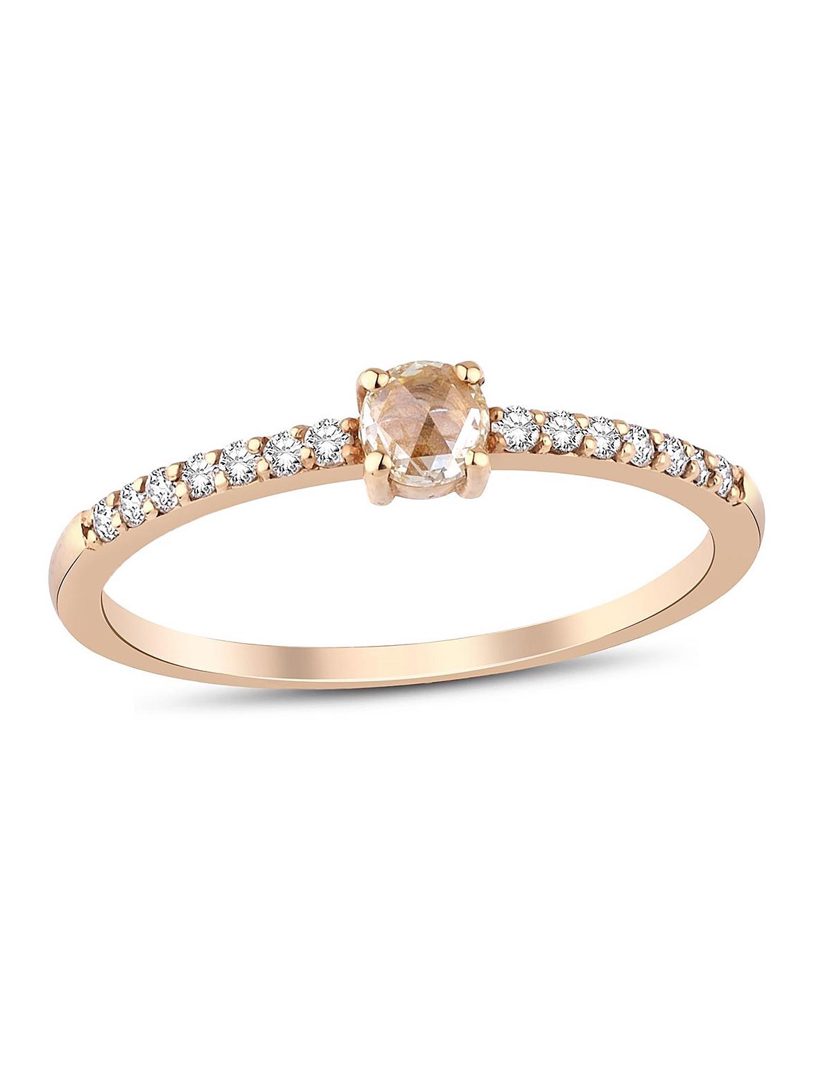 Klasik bir yüzük koluna klasik bir taş evi yerleştirerek tasarladığımız; 0.14 Karat Pırlanta 0.16 Karat Şampanya Rengi Elmas Yüzük 'te ortada şampanya rengi ve krone ( tablası yüksek ve ışığı iyi kıran bir form ) elmas kullandık. Tektaş yüzüğümüzün altın kısmı pembe altın ( rose gold ) ve parlaktır. Tüm kadınların evlilik yüzüğü, nişan yüzüğü olarak tercih edilebilmesinin yanı sıra özgün formu sayesinde gün içinde veya çalışırken de rahatlıkla kullanabilecekleri bir pırlanta yüzüktür.