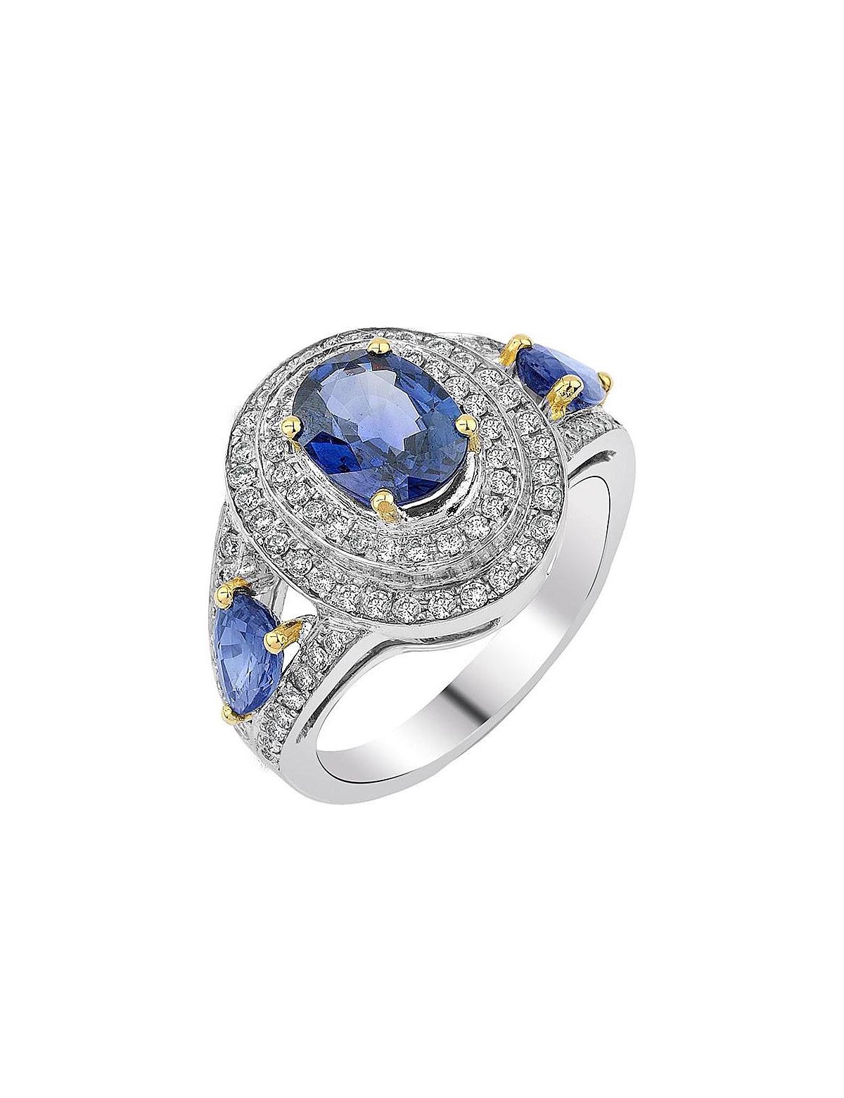 Oval safirin etrafında oldukça som mıhlanan pırlantaları ile Çift Sıra Pırlanta Tasarım Safir Yüzük 'ümüz tamamen parlak. Kolların da yer alan 2 adet damla safir ve genel kademeli yapısı ile her açıdan parlıyor. Özel günlerinizde kullanabileceğiniz şık bir yüzük.