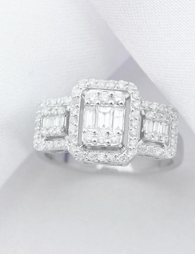 14 ayar beyaz altın ile ürettiğimiz; 0.62 Karat Baget Pırlanta Yüzük (E-F VS/Tria Baget) 'ümüz tamamen parlaktır. Pırlanta Beget Yüzük 'ümüzün ortasındaki baget taşların etrafında dönen köşeli çerçeve, ortadaki Baget Pırlanta 'ların sağ ve soldakilerden daha büyük ve yüksekte olması sayesinde Pırlanta Yüzük 'ümüze gösteriş ve derinlik katıyoruz.