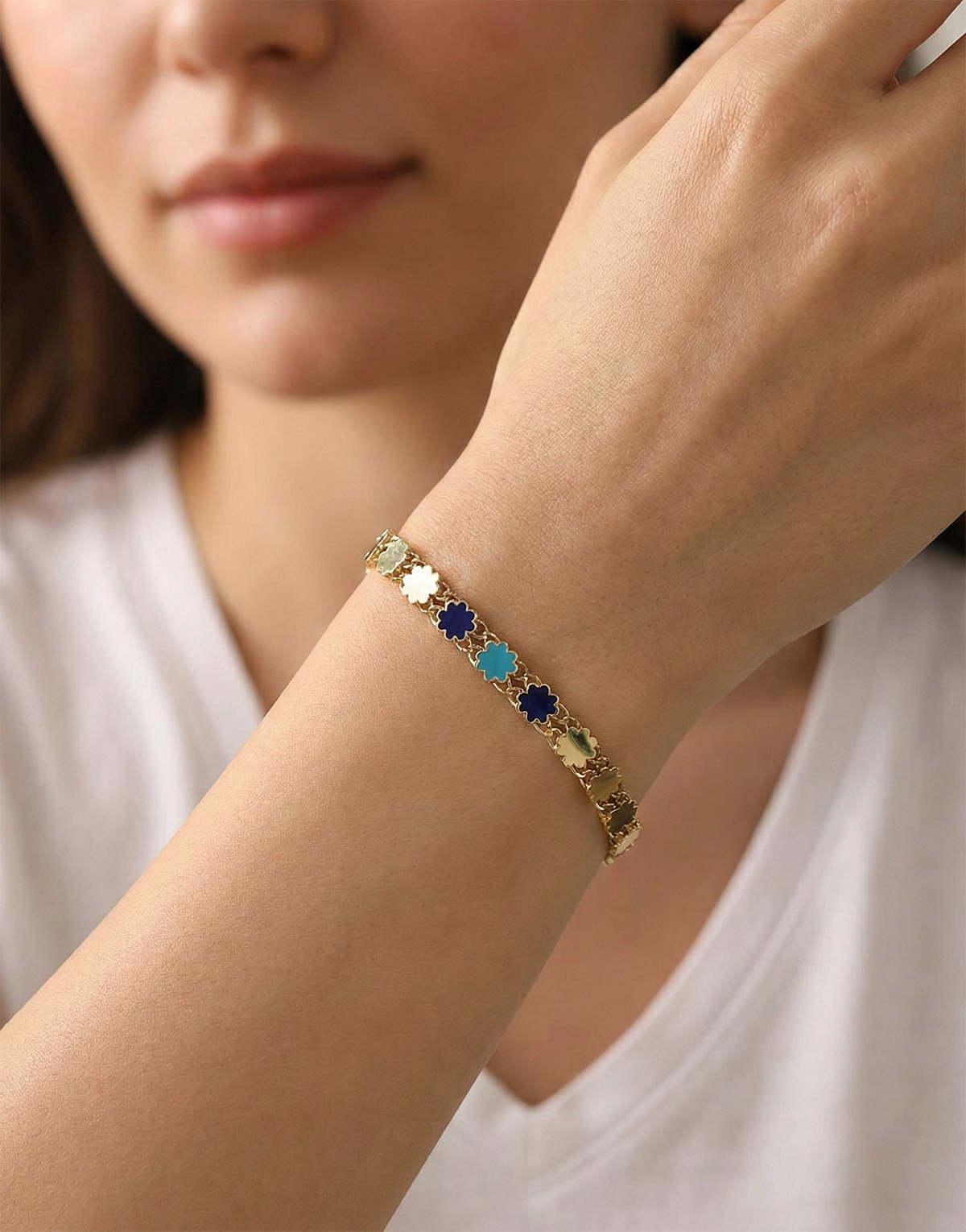 14 ayar sarı altın ile ürettiğimiz; Altın MaviÇiçek Bileklik tamamen parlaktır. Minik ama boyutlu parçalarının eklemli ve hareketli olarak bağlanmış olmaları sayesinde her açıdan parlıyan minimalist bileklik.. Çalışırken, gün içinde kıyafetlerinizle kolaylıkla kombinleyebileceğiniz bir altın bileklik. Mavi mineli bölümlerin canlı renkleri göz alıcı.