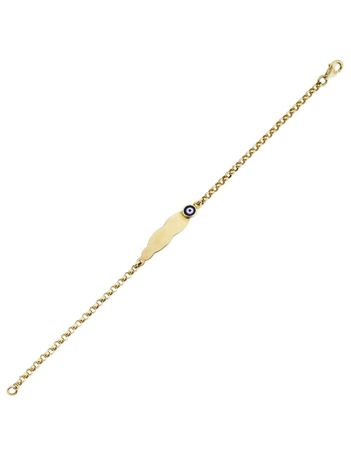 14 ayar sarı altın ile ürettiğimiz; Göz Mineli Nazar Boncuğu Altın Çocuk Bileklik tamamen parlaktır. Aslında Plakalı Bebek Künye olarak da ifade edebiliriz. Çünkü zincirin dilediğiniz halkasından kilidini bağlayarak 0-12 yaş arası kullabileceğiniz bir Altın Çocuk Bileklik 'tir. İstediğiniz yazı karakteri ile üzerine yazmamızı talep edebilirsiniz.
