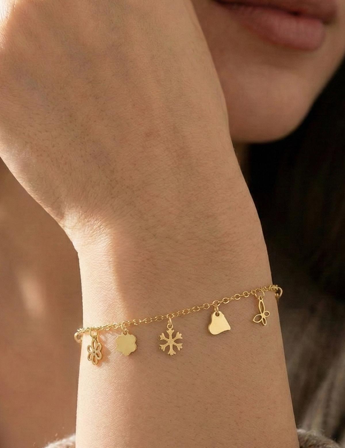 14 ayar sarı altın ile ürettiğimiz; Altın Şans Bilekliği 'imiz tamamen parlaktır. Sallantılı yıldız figürleri ile oldukça sportif figürleri Çiçek, Kar tanesi, Kalp, Kelebek Yonca Bileklik. Gün içinde ve çalışırken kıyafetlerinizle kombinleyebileceğiniz bir Altın Bileklik.