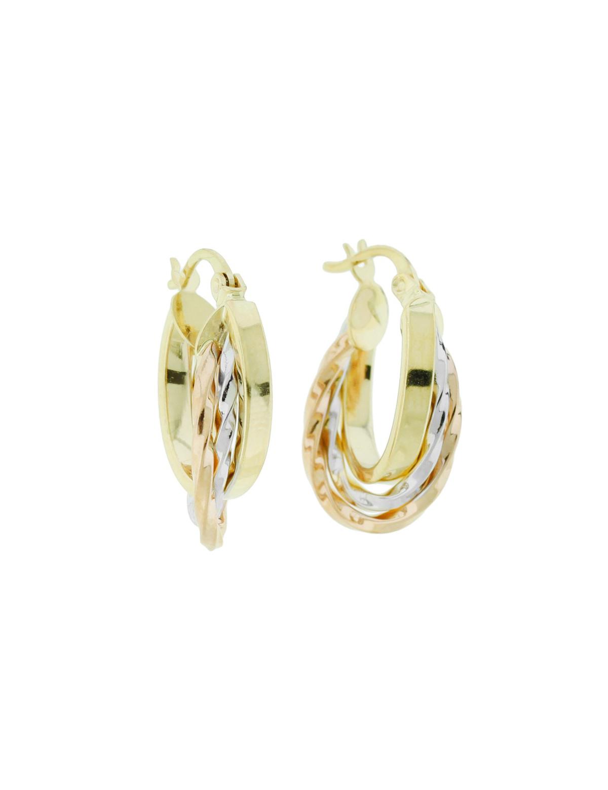 14 ayar sarı, beyaz, pembe altın (rose) ile ürettiğimiz; Üç Renk Altın Halka Küpe 'miz tamamen parlaktır. Birbirine sarmal biçimde tutunmuş ve biraz burularak şeker gibi keyifli modern bir altın küpe ürettik. Gün içinde ve çalışırken kıyafetlerinizle rahatlıkla kullanabileceğiniz bir görsel.