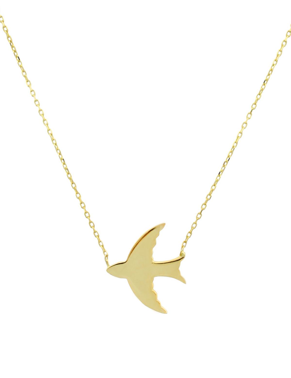 14 ayar sarı altın ile ürettiğimiz; Altın Kırlangıç Kolye 'miz tamamen parlaktır. Minimalist yapısı sayesinde gün içinde, çalışırken kıyafetlerinizle veya diğer kolyelerinizle kolaylıkla kombinleyebileceğiniz bir günlük altın kolye.