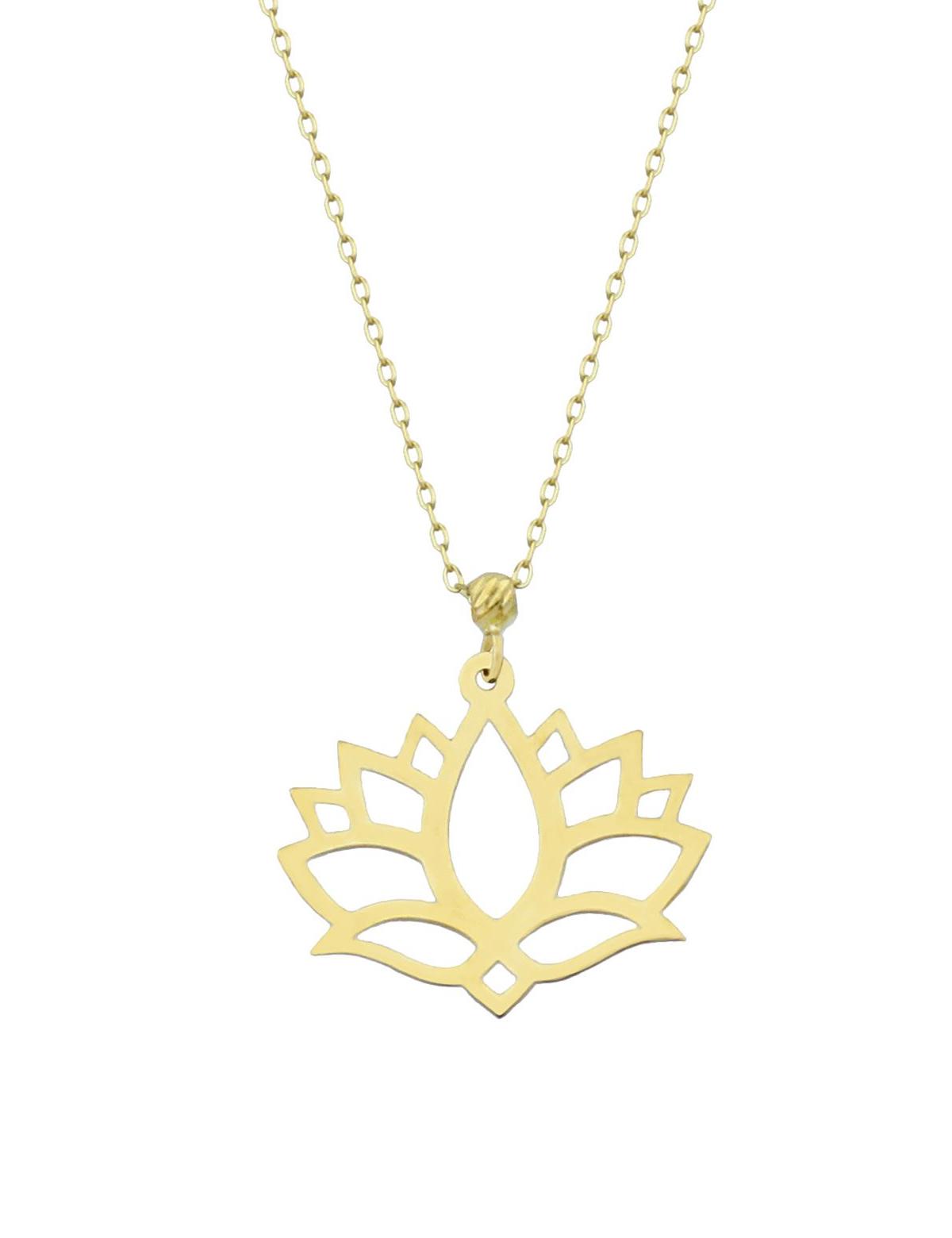 14 ayar sarı altın rengi ile tamamen parlak ürettiğimiz; 14 Ayar Altın Lotus Çiçeği Kolye  'miz düz bir plaka üzerie işlenmiştir. Simgesel figürleri taşımayı seven tüm kadınların gün içinde veya çalışırken kullanabileceği bir kolye.