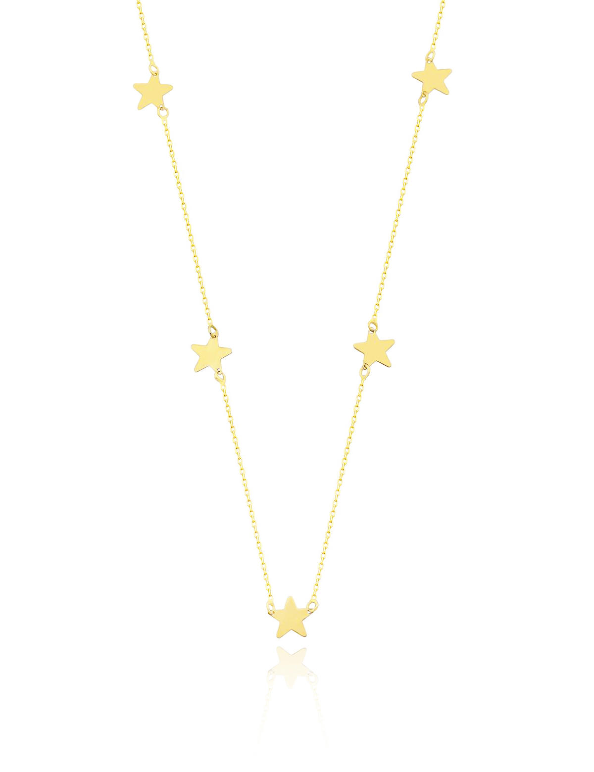 14 ayar sarı altın ile ürettiğimiz; Altın Beş Yıldız Kolye 'miz tamamen parlaktır. Hepimizin beş yıldızı vardır. Düz altın plakalardan kestiğimiz yıldızlarımızı klasik zincire dizdik. Gün içinde rahatlıkla kıyafetlerinzile kombinleyebileceğiniz bir günlük Altın Kolye 'miz.
