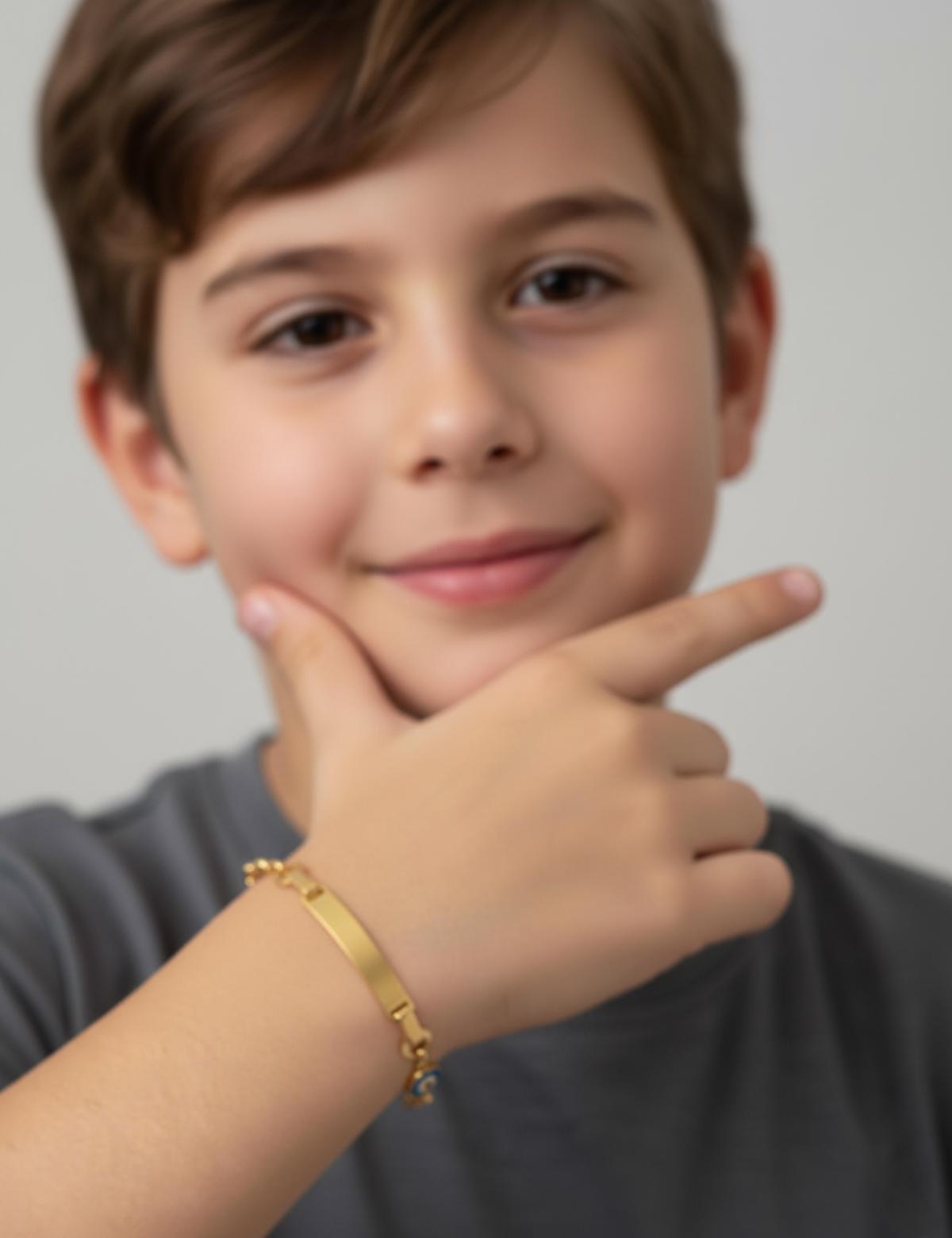 14 ayar sarı altın ile ürettiğimiz; Göz Mineli Nazarlık Altın Çocuk Künye Bileklik tamamen parlaktır. Aslında Plakalı Bebek Künye 'si olarak da ifade edebiliriz. Çünkü zincirin dilediğiniz halkasından kilidini bağlayarak 0-12 yaş arası kullabileceğiniz bir Altın Çocuk Bileklik 'tir. Dilediğiniz yazı karakteri ile üzerine yazmamızı talep edebilirsiniz.