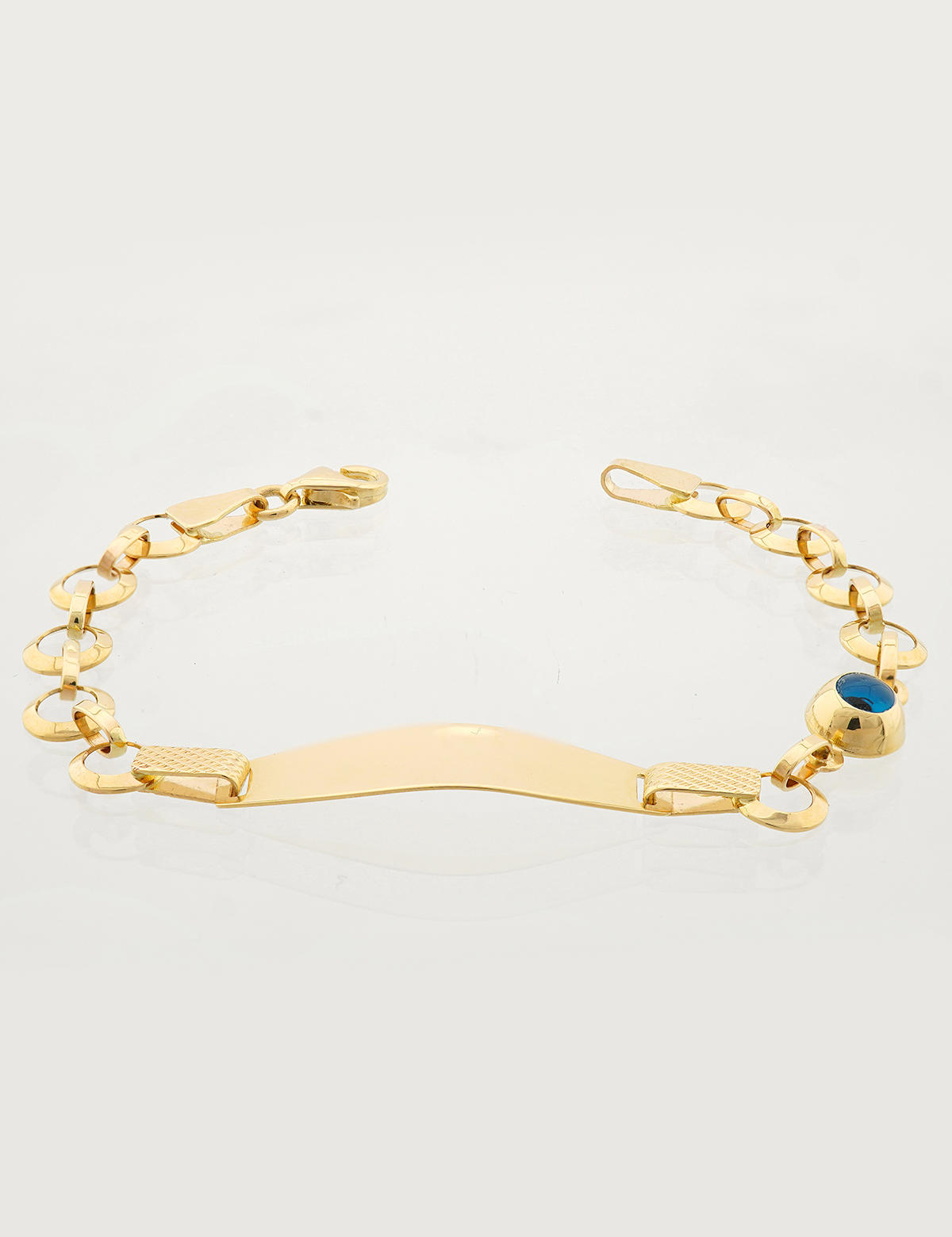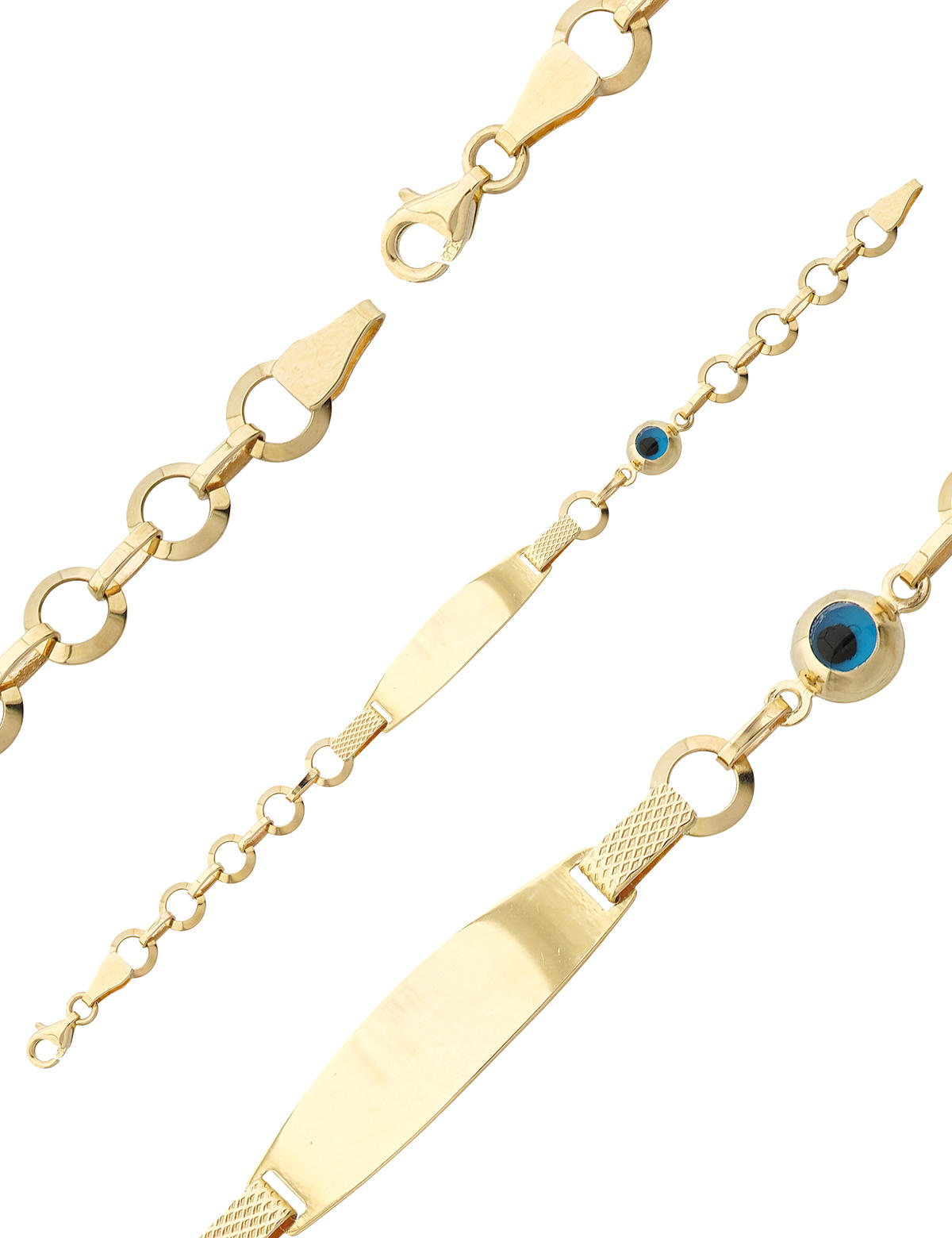 14 ayar sarı altın ile ürettiğimiz; Göz Boncuğu Nazarlık Altın Çocuk Künye Bileklik tamamen parlaktır. Aslında Plakalı Bebek Künye 'si olarak da ifade edebiliriz. Çünkü zincirin dilediğiniz halkasından kilidini bağlayarak 0-12 yaş arası kullabileceğiniz bir Altın Çocuk Bileklik 'tir. Dilediğiniz yazı karakteri ile üzerine yazmamızı talep edebilirsiniz.