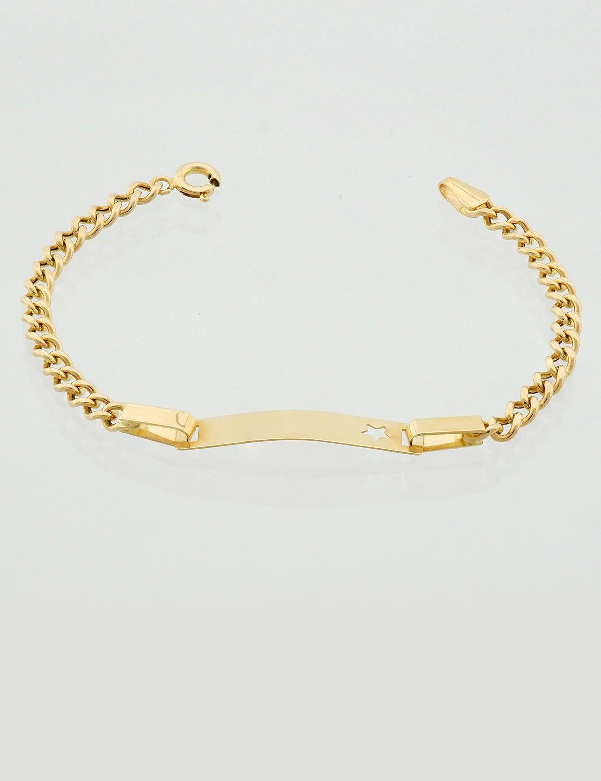 14 ayar sarı altın ile ürettiğimiz; Yıldız Figürlü Altın Çocuk Künye Bileklik tamamen parlaktır. Aslında Plakalı Bebek Künye 'si olarak da ifade edebiliriz. Çünkü zincirin dilediğiniz halkasından kilidini bağlayarak 0-12 yaş arası kullabileceğiniz bir Altın Çocuk Bileklik 'tir. Dilediğiniz yazı karakteri ile üzerine yazmamızı talep edebilirsiniz.