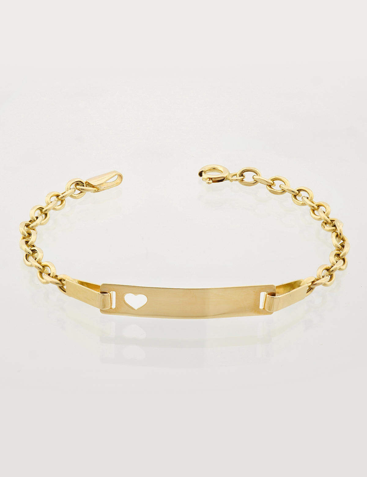 14 ayar sarı altın ile ürettiğimiz;Altın Çocuk Künye Bileklik-Kalp Figürlü tamamen parlaktır. Aslında Plakalı Bebek Künye 'si olarak da ifade edebiliriz. Çünkü zincirin dilediğiniz halkasından kilidini bağlayarak 0-12 yaş arası kullabileceğiniz bir Altın Çocuk Bileklik 'tir. Dilediğiniz yazı karakteri ile üzerine yazmamızı talep edebilirsiniz.