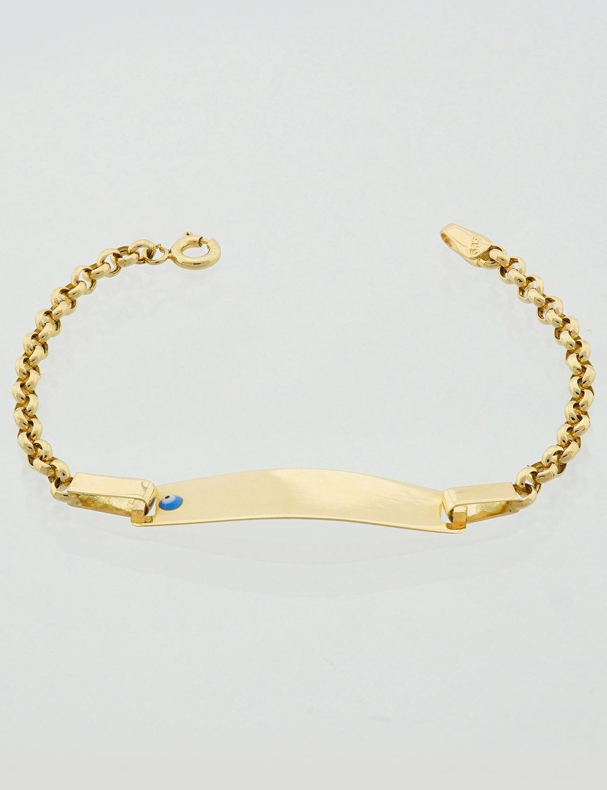 14 ayar sarı altın ile ürettiğimiz; Altın Çocuk Künye Bileklik-Nazar Boncuklu modelimiz tamamen parlaktır. Aslında Plakalı Bebek Künye 'si olarak da ifade edebiliriz. Çünkü zincirin dilediğiniz halkasından kilidini bağlayarak 0-12 yaş arası kullabileceğiniz bir Altın Çocuk Bileklik 'tir. Dilediğiniz yazı karakteri ile üzerine yazmamızı talep edebilirsiniz.