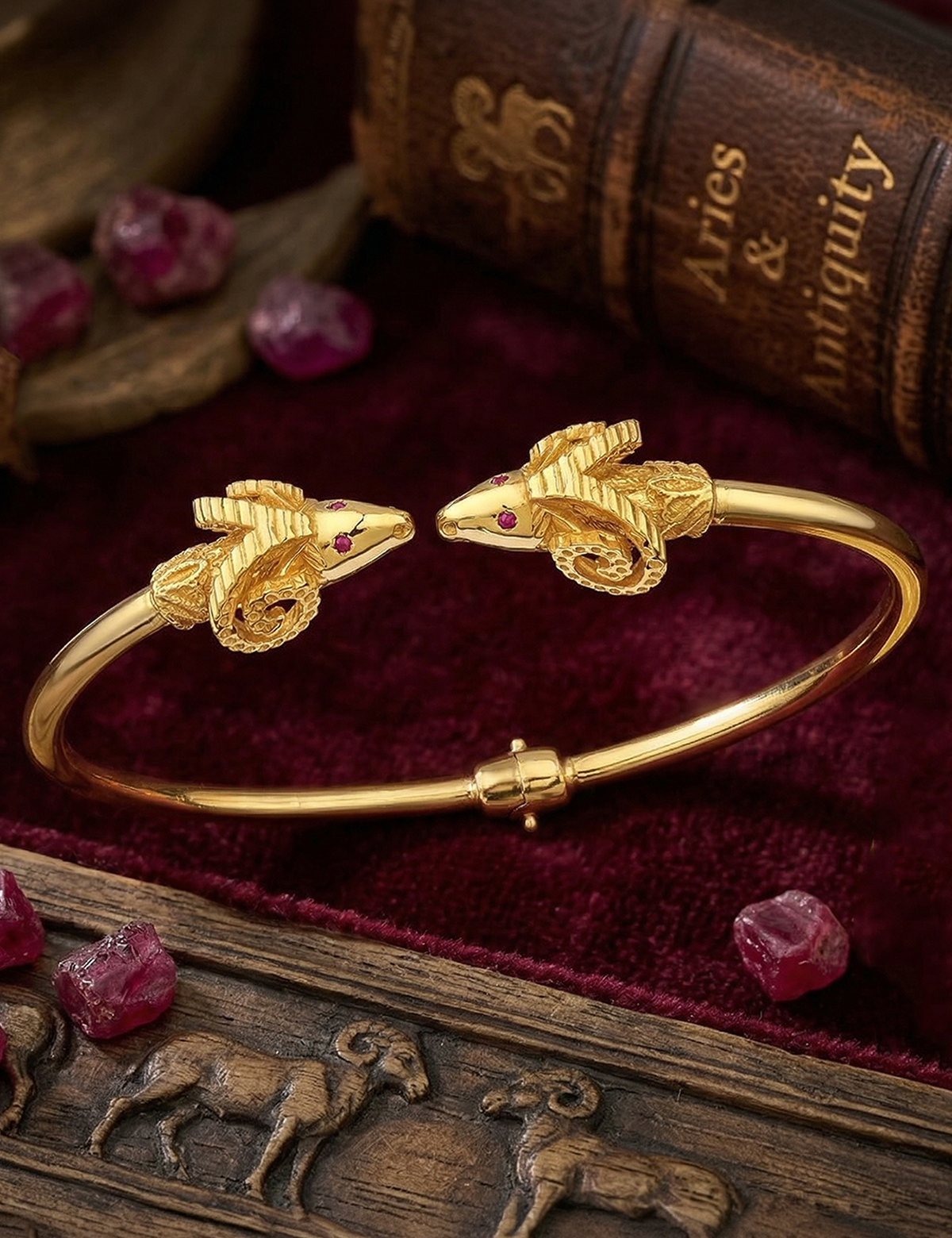 Koç başı kelepçe bilezik modelimiz 22 ayar altından üretilmiştir. Gövdesi klasik düz parlak olarak yapılmış olup, kol kısımların başında iki adet koç başı figürü ve koç burcu ile özdeşleşen yakut taşlar... Ateş grubunun karakteristik özelliği yakutlar ile ifade edildi. Hem günlük kullanımda veya özel bir hediye düşünenler için tercih edilebilir. Koç burcunun enerjisini vurgulamak isteyen Koç burcu kadınları için de uygun bir seçenektir.