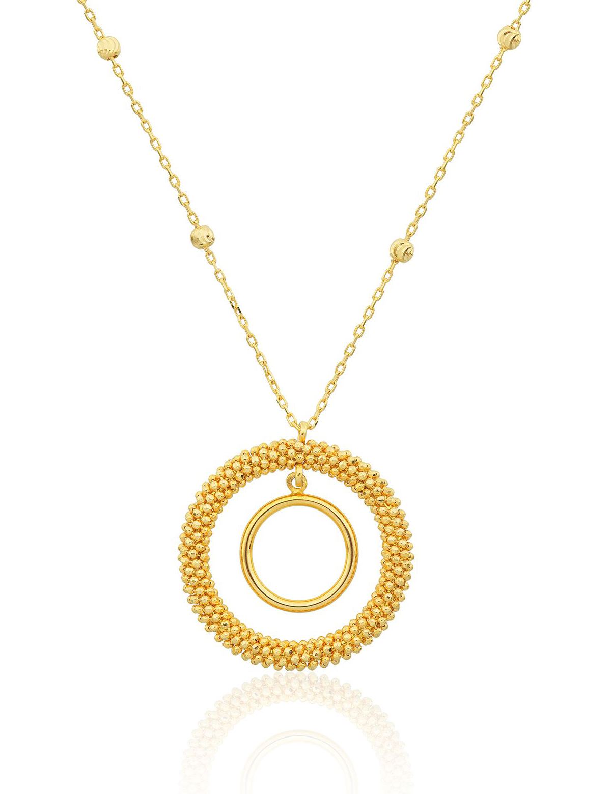 22 Ayar Altın Vizzaro Halka Kolye 'miz çift halka kullanılarak biraz daha gösterişli durmasını desteklemiştir. Büyük olan halkanın etrafı ufak toplar ile süslenerek ürünün parlaklığı ve kondisyonu arttırılmıştır. Tok ve parlak duruşu özel gün ve normal yaşamınızda keyifle kullanabileceğiniz bir konfora sahiptir..