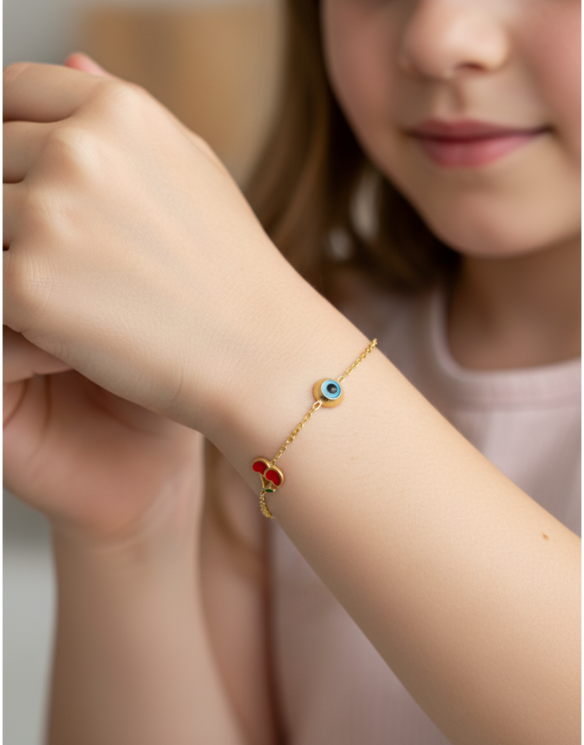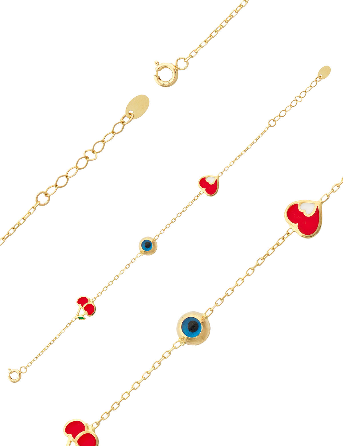 Altın Mineli Çocuk Bilekliği - Kiraz, Nazar boncuğu, Kalp Figürlü