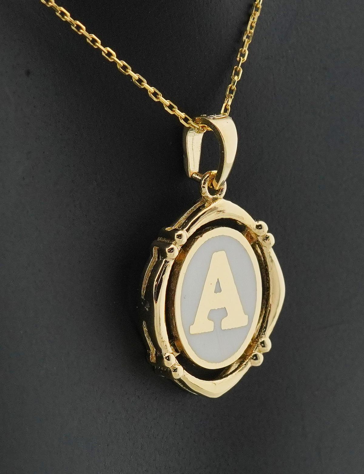 14 ayar sarı altın ile ürettiğimiz harf kolyemiz, zamansız tasarımı ve inci beyazı rengindeki mine üzerine harfin konumlanması kendisini ön plana çıkartıyor.