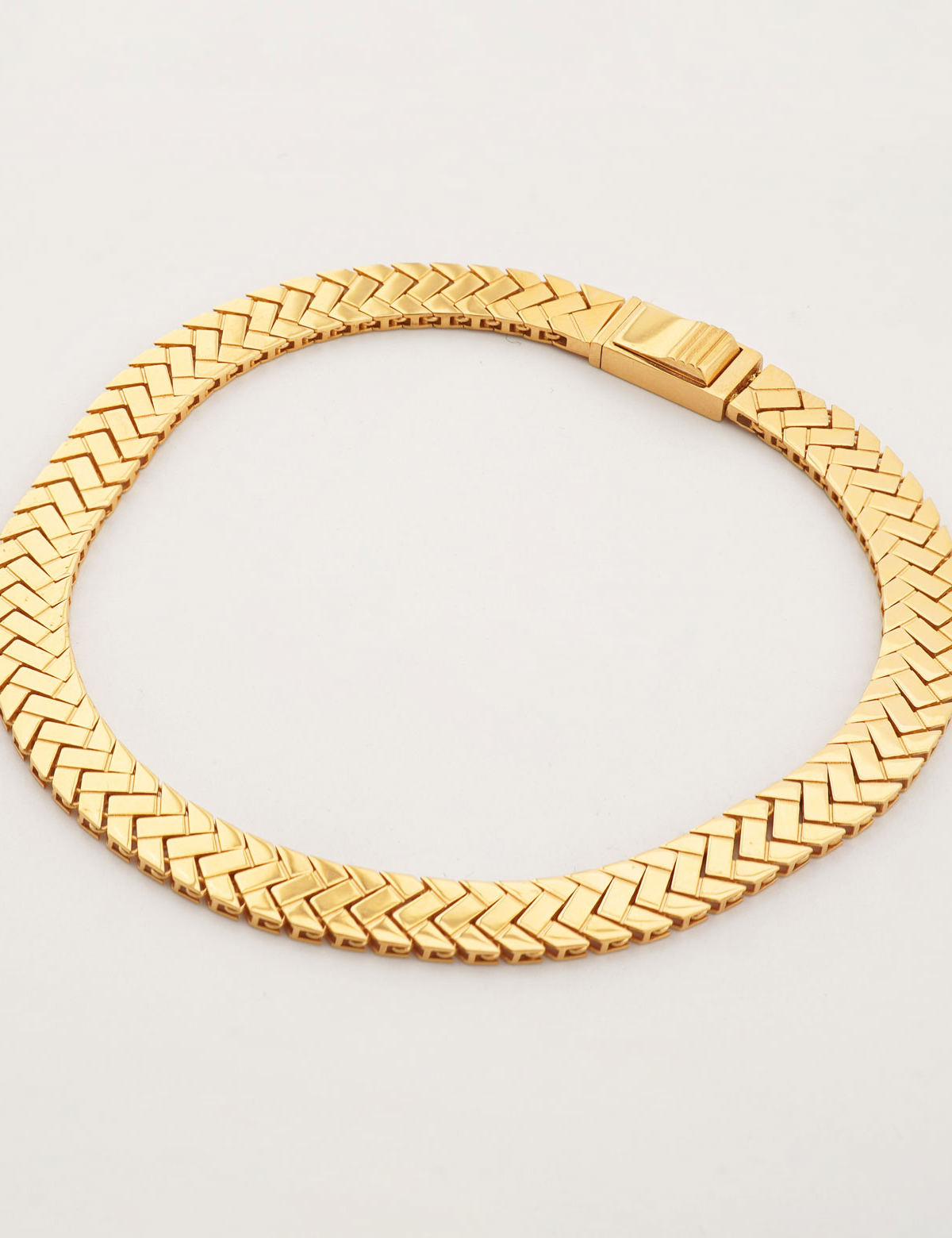 22 Ayar sarı altın ile ürettiğimiz Geometrik Kenetli Zincir Bileklik' imiz V şeklindeki parçaların sıkıca birbirine kenetlenmesiyle oluşan yassı bir örgü (balıksırtı) formuna sahiptir. Bileğe tam oturan düz yapısı ve güvenli kutu kilit mekanizması sayesinde kolda bütünlük sağlar.