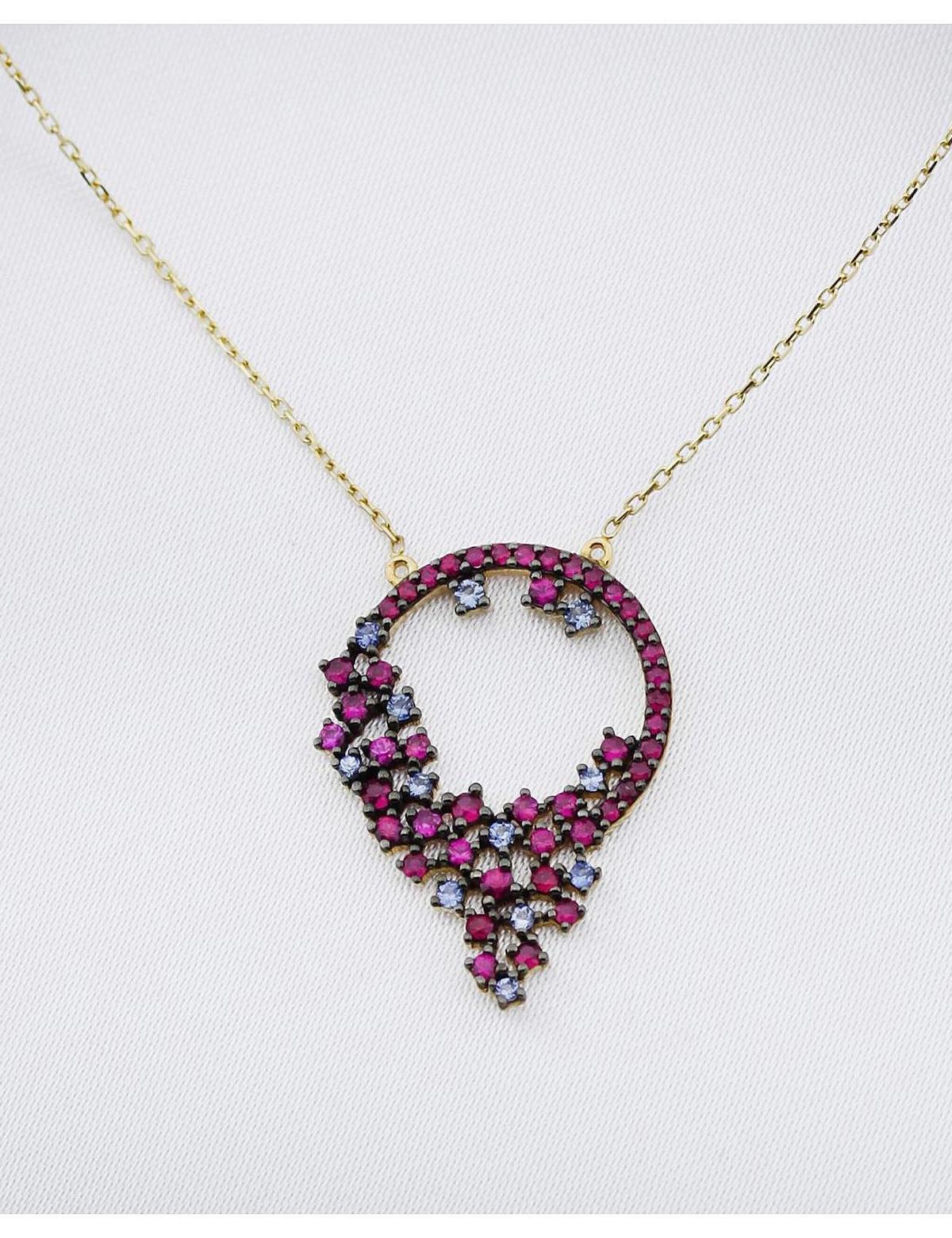 Dairesel formun içerisinden aşağıya doğru süzülen doğal taşlar, kolyeye modern ve akışkan bir hava katıyor. Yakutun canlı kırmızısı ile safirin derin mavisi, asimetrik bir dizilimle harmanlanarak zengin bir renk kontrastı oluşturuyor. Yakut ve safir taşların yoğunluğu ve salkım formu, boyunda dolgun ve dikkat çekici bir duruş sergiler.