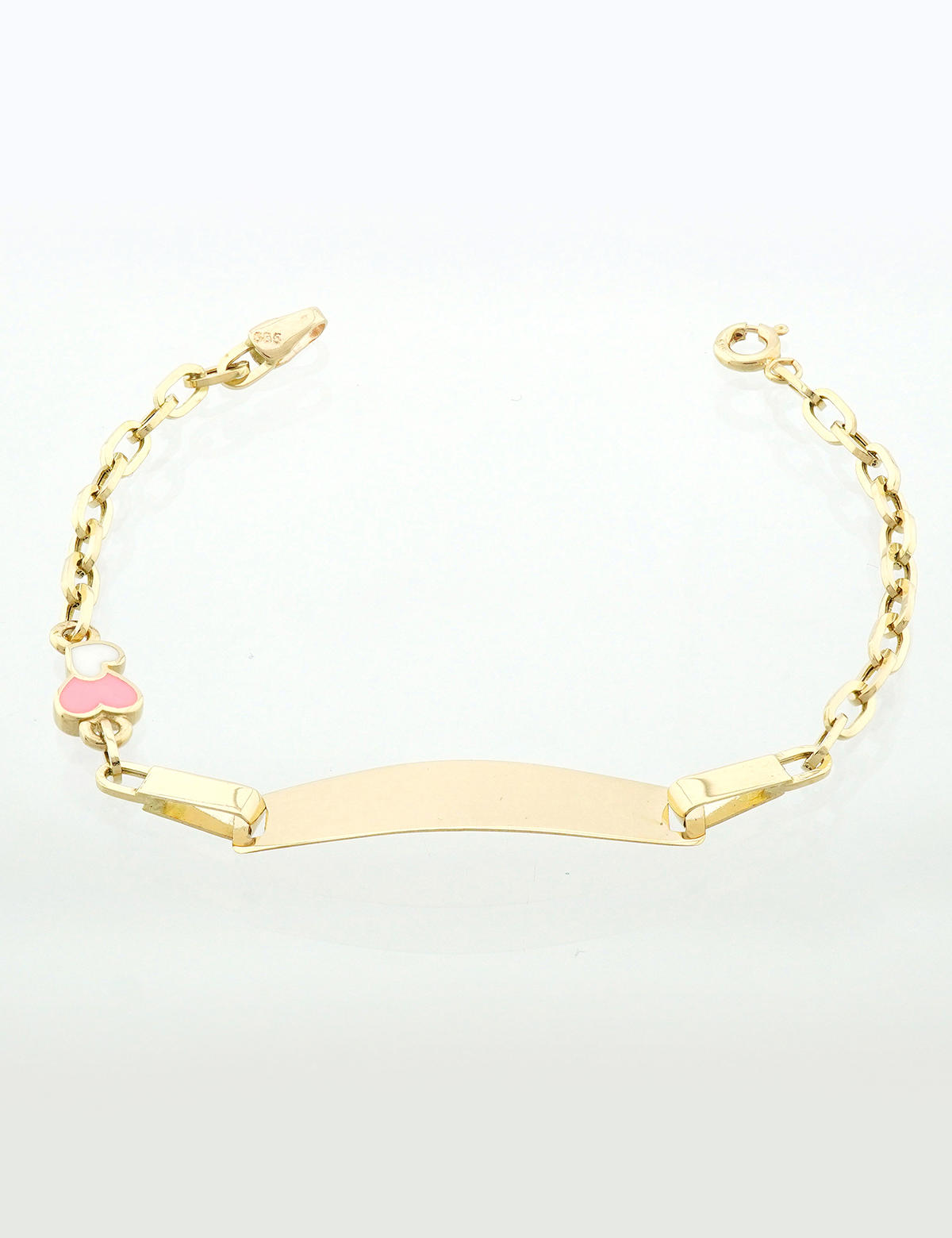 Zarif zincir üzerine kurulu bu 14 ayar sarı altın künye, plakasıyla bütünleşen pembe mineli birleşik kalp motifi ile ön plana çıkıyor. İç içe geçmiş bu kalpler, sonsuz sevgiyi ve bağlılığı simgeler.