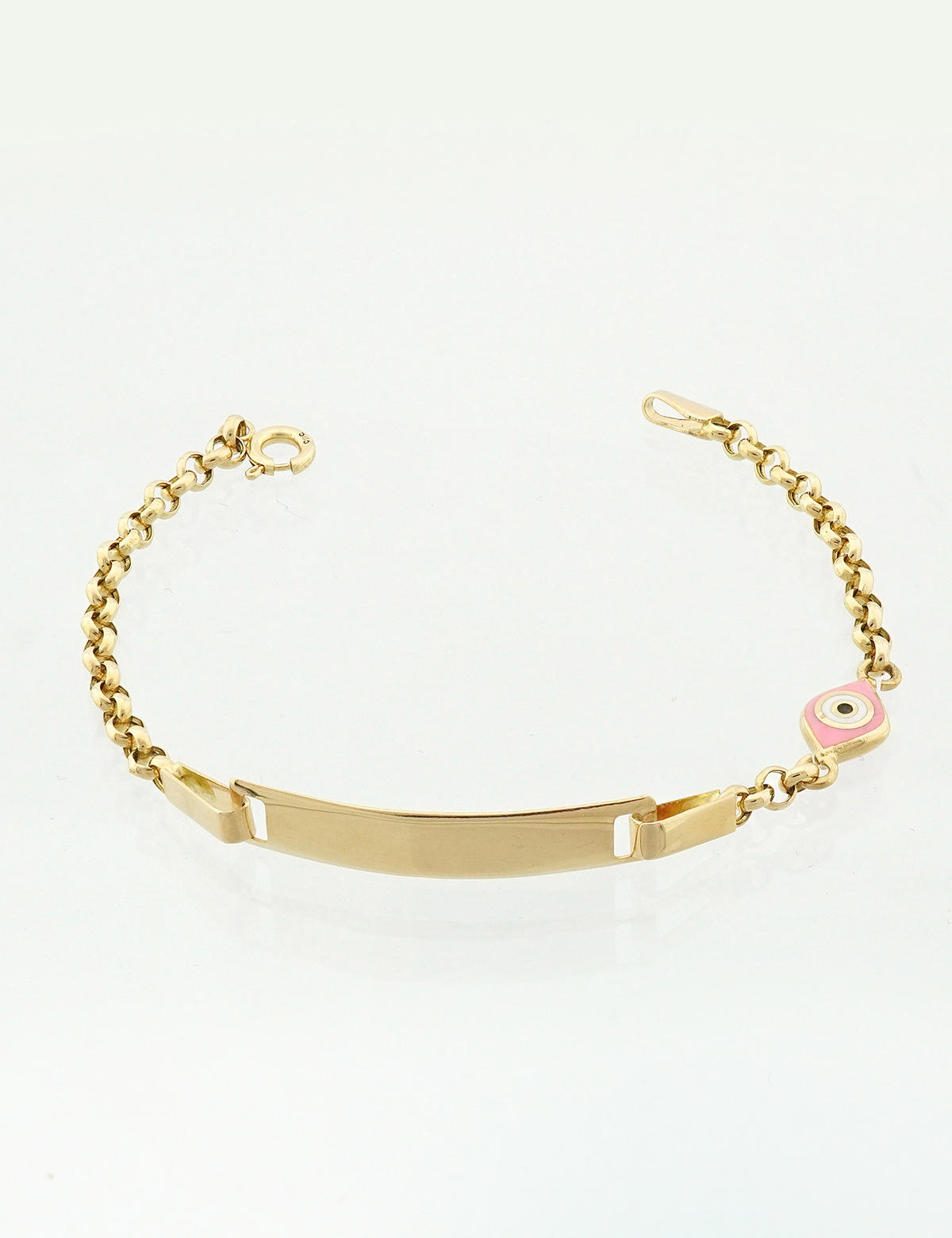 14 ayar sarı altın künye, bilekte zarif duran halka halka zincir ile üretilmiştir, zincirin bu yapısı farklı uzunluklarda kullanım imkanı sağlamaktadır. Bilekliğin en özel detayı ise, sevimli pembe mine çerçeveli nazar boncuğudur; hem koruma anlamı taşır hem de şıklık katar.