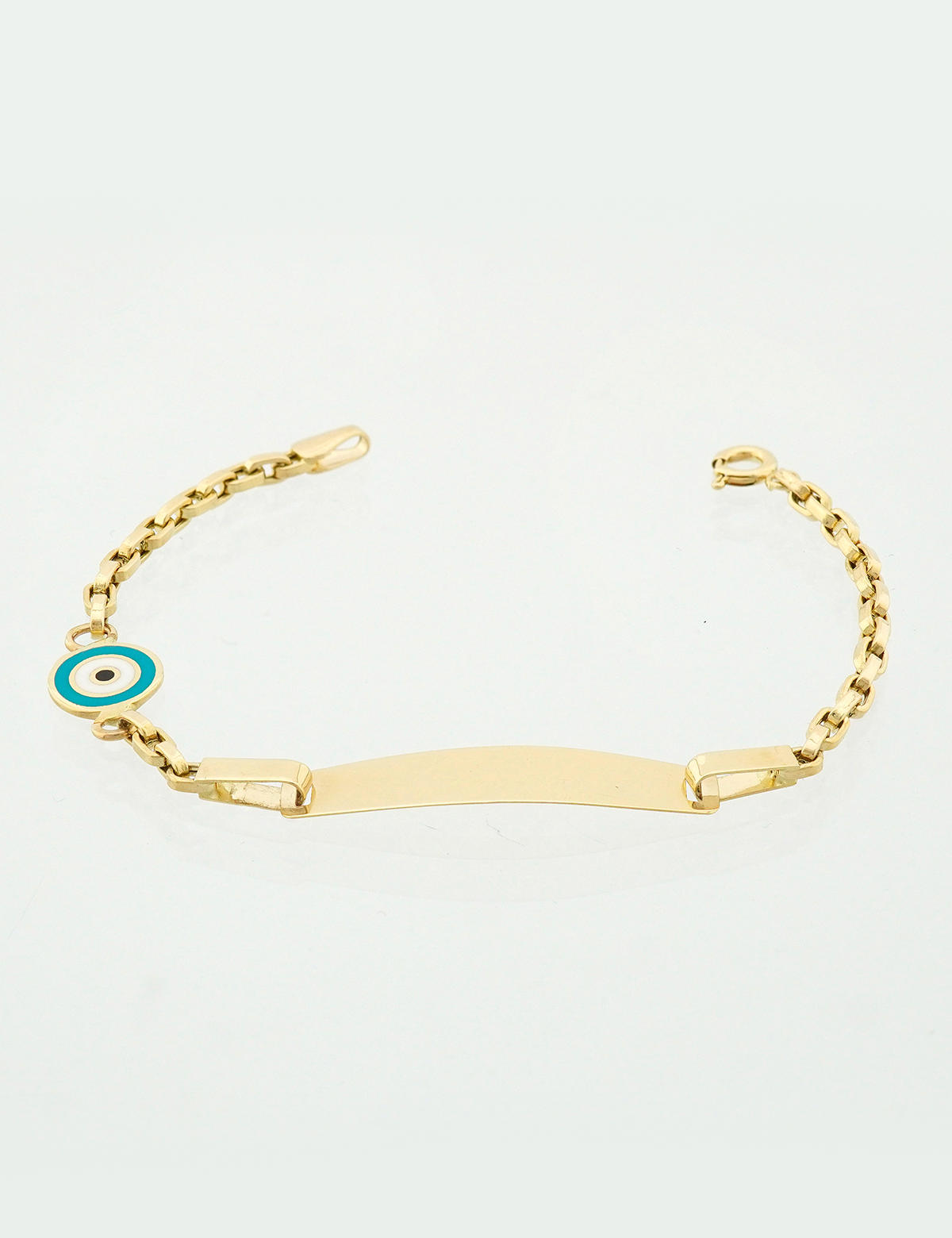 14 ayar sarı altın ile ürettiğimiz Mineli Göz Çocuk Künye Bileklik' imiz tamamen parlaktır. Klasik künye tasarımını minik bir mine nazar boncuğu detayıyla tamamladık. Nazar boncuğu, geleneksel koruyucu anlamıyla bu değerli takıyı daha da özel kılar.