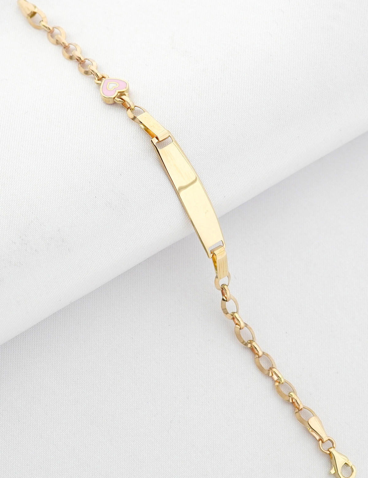 Bu 14 ayar sarı altın künye, sevginin sembolü olan pembe mineli kalp figürüyle dikkat çeker. Bilekliğin en kullanışlı özelliği ise, geniş halkalı zinciri sayesinde kilidin istenen halkaya takılabilmesidir.