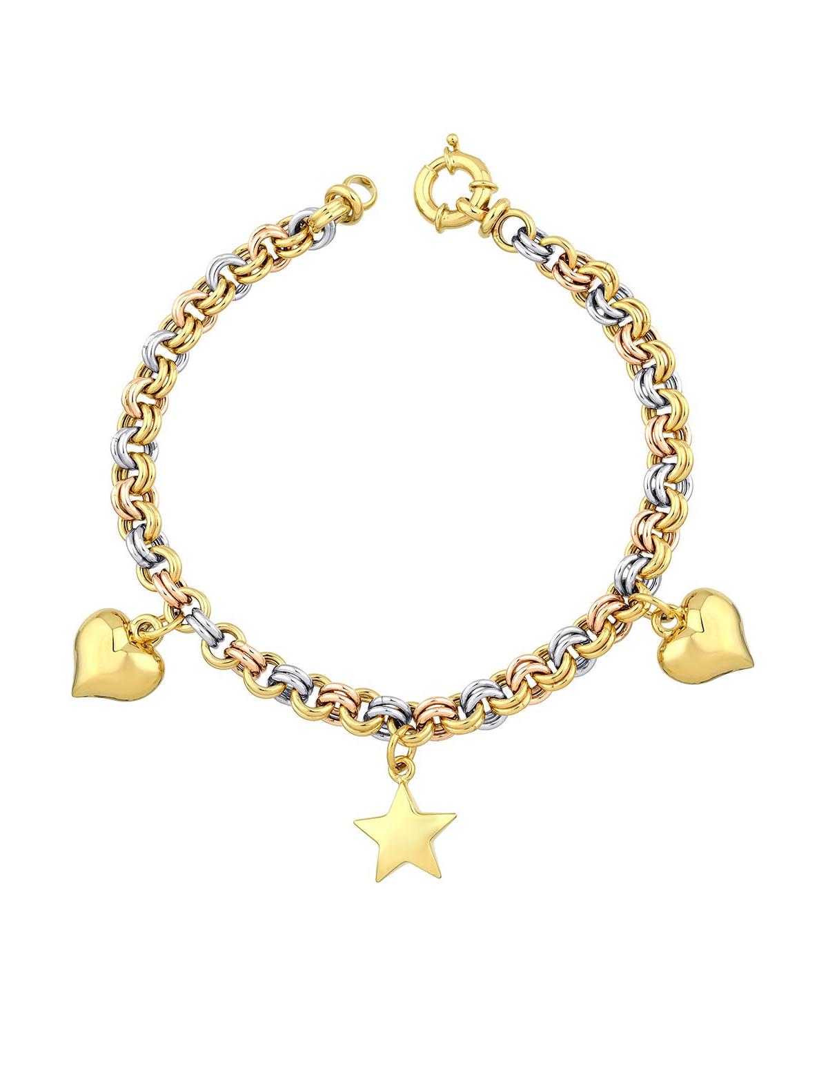 Motifli Kalp Zincir 14 Ayar Altın Bileklik zincirinde yer alan beyaz altın, rose altın ve sarı altın detaylarla taçlandırır. Yıldız figürüyle hareket kazanan tasarım, bileğinizde zarifçe sallanan kalp detayıyla tasarıma canlı ve dikkat çekici bir karakter katar. 14 ayar altının ışıltısıyla hem günlük kullanımda hem de özel anlarda stilinize zarafet, şans ve ışık katan özel bir parça olarak öne çıkarır.