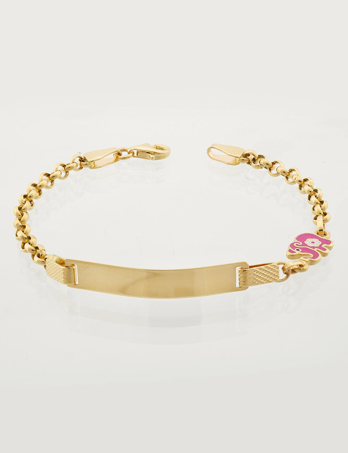 14 ayar sarı altın ile ürettiğimiz; Pembe Fil Çocuk Künye Bileklik tamamen parlaktır. Aslında Plakalı Bebek Künye 'si olarak da ifade edebiliriz. Çünkü zincirin dilediğiniz halkasından kilidini bağlayarak 0-12 yaş arası kullabileceğiniz bir Altın Çocuk Bileklik 'tir. Dilediğiniz yazı karakteri ile üzerine yazmamızı talep edebilirsiniz.