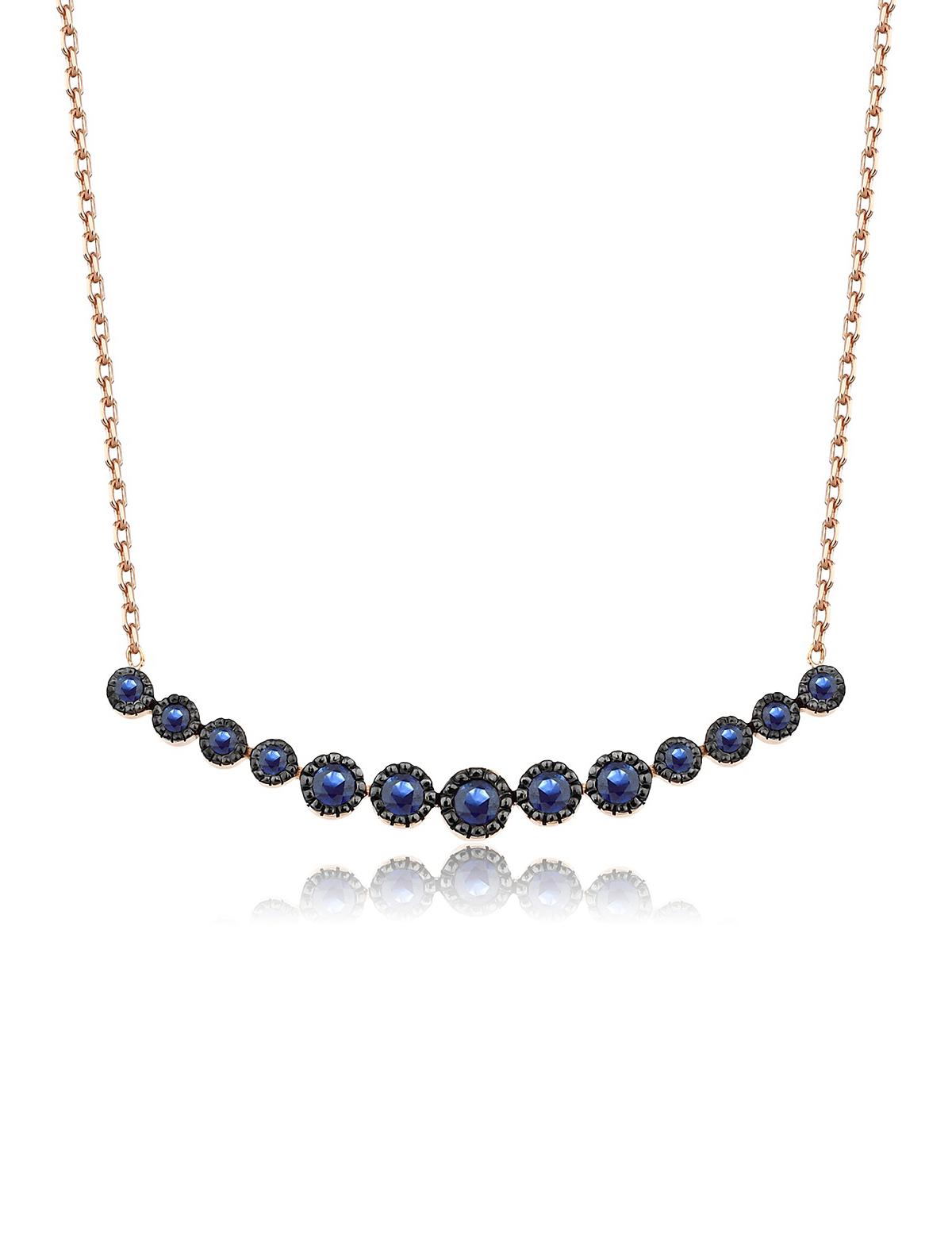 Kraponyalı ( taşlar mıhlandıktan sonra etrafına özel bir yöntem ile çıkartılan tırnaklar ) taş evlerine özel bir yöntem ile siyah kapladığımız Su Yolu Safir Kolye 'mizin taşları transparan ve ışıltılı. Taşlarımızı küçükten ortada büyüğe doğru sıraladık. Su yolu kolyenin doğal renkli taşlar ile üretilmesi hemen farkedebileceğiniz özgün bir parlaklık katıyor. Mücevher seven kadınların vazgeçemeyeceği keyifli bir safir kolye.